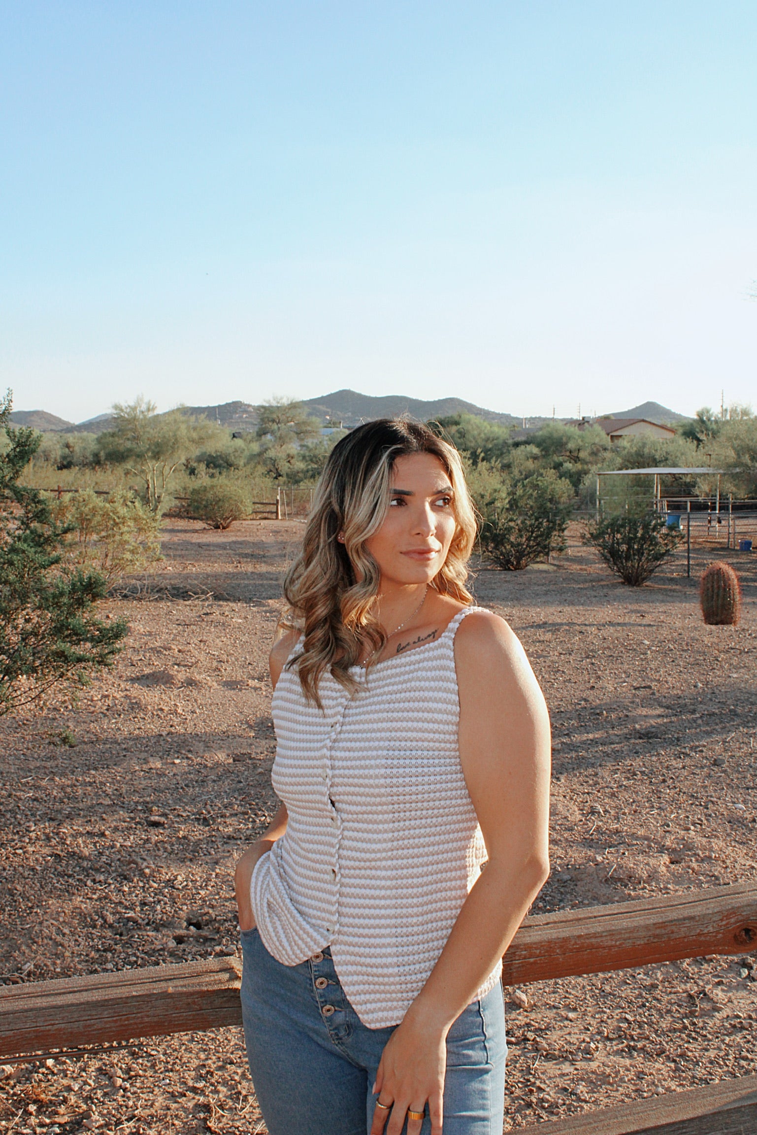 Add a touch of desert-inspired charm with our Mesa Striped Tank. Crafted from soft waffle knit fabric, this tank features a flattering fit with button details down the front for a hint of western flair. The subtle striped pattern adds texture and warmth, making it perfect for pairing with your favorite denim and a cute pair of booties. Whether layered under a shacket or worn solo on sunny days, this top brings effortless boho style to any outfit.